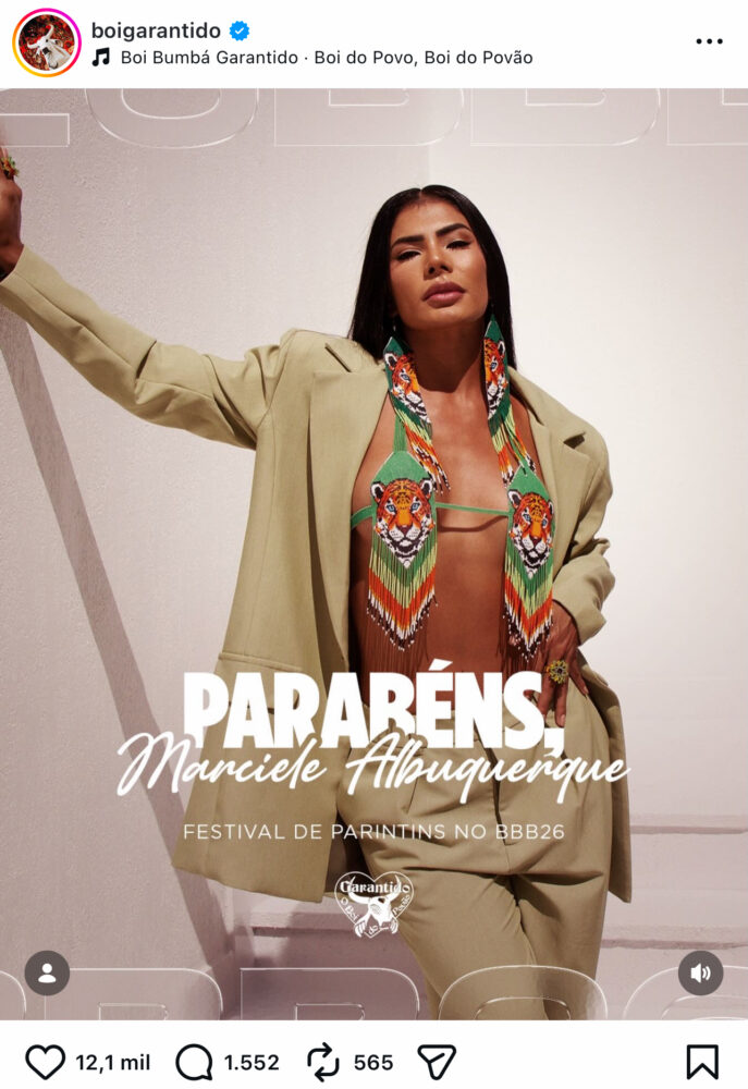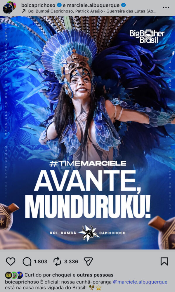 A confirmação da participação repercutiu entre instituições culturais do Amazonas. O Boi Caprichoso celebrou oficialmente a presença da cunhã-poranga no BBB26, destacando o orgulho de ver a cultura amazônica representada em um dos maiores palcos do entretenimento nacional.