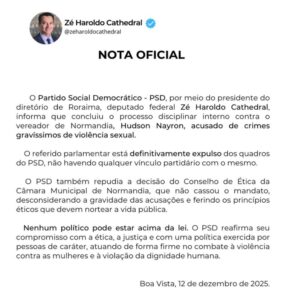 O Partido Social Democrático (PSD) anunciou oficialmente a expulsão definitiva do vereador Hudson Nayron Cunha, do município de Normandia (RR), após conclusão de processo disciplinar interno motivado pelas graves denúncias de crimes de violência sexual que ele enfrenta.